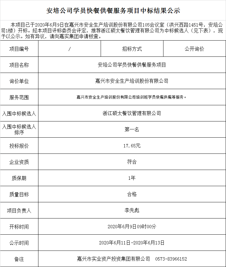 安培公司學(xué)員快餐供餐服務(wù)項目中標結(jié)果公示