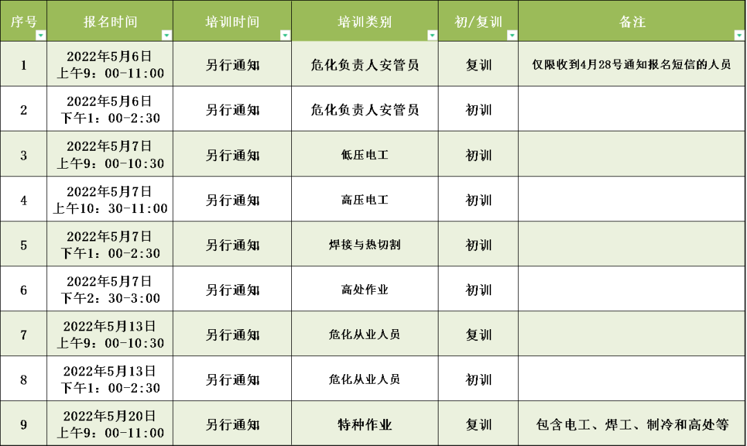 (三)線下報名所需資料 1.特種作業復訓 (1)報名申請表;(2)身份證原件;(3)一張1寸照片;(4)報名時請攜帶特種作業操作證原件。 2.危化負責人安管員初復訓 (1)填寫并提交《危險物品生產經營單位主要負責人、安管員安全培訓申請登記表》,需由申請人簽字確認,并加蓋單位公章; (2)報名時請攜帶身份證原件;(3)兩寸免冠照1張;(4)公司營業執照復印件;(5)復訓人員需攜帶考核合格證件原件。 3.危化從業人員初復訓 (1)填寫并提交《危化品生產經營單位從業人員安全培訓申請登記表》;(2)報名時請攜帶身份證原件;(3)兩寸免冠照1張(不著紅色上衣,背景為藍底或白底);(4)提供初中或初中以上學歷證明復印件。 4.特種作業初訓 (1)報名申請表;(2)身份證原件;(3)一張1寸照片;(4)初中及以上學歷證明復印件一份(或者戶口本本人頁復印件(含文化程度))。