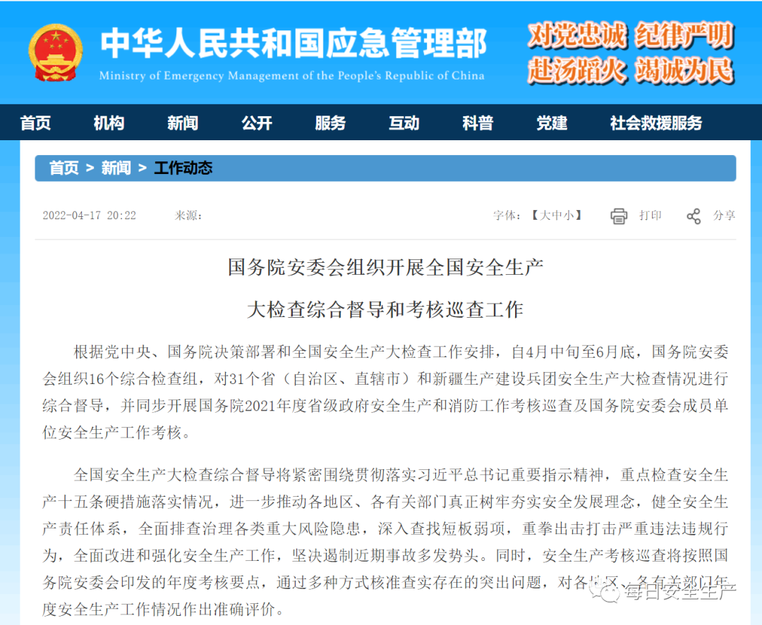 根據黨中央、國務院決策部署和全國安全生產大檢查工作安排,自4月中旬至6月底,國務院安委會組織16個綜合檢查組,對31個省(自治區、直轄市)和新疆生產建設兵團安全生產大檢查情況進行綜合督導,并同步開展國務院2021年度省級政府安全生產和消防工作考核巡查及國務院安委會成員單位安全生產工作考核。重點查十五條硬措施!