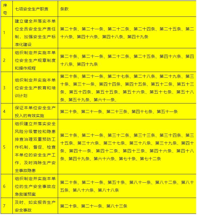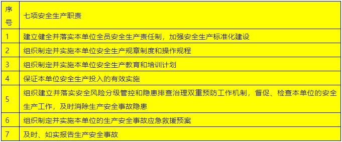 企業(yè)主要負(fù)責(zé)人法定七項(xiàng)安全生產(chǎn)職責(zé)內(nèi)容見(jiàn)下表: