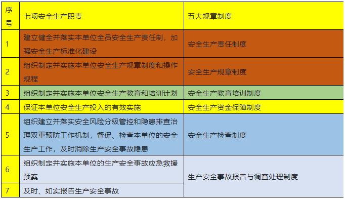 以生產(chǎn)經(jīng)營(yíng)單位主要負(fù)責(zé)人七項(xiàng)安全生產(chǎn)職責(zé)來(lái)講,亦可歸納為五大制度,均可歸結(jié)為安全生產(chǎn)規(guī)章制度,如下表所示: 七項(xiàng)安全生產(chǎn)職責(zé)與安全生產(chǎn)“五大規(guī)章制度”關(guān)系對(duì)照表