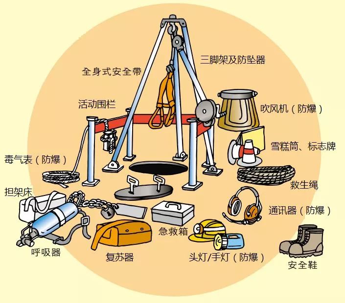 應(yīng)急計劃 應(yīng)根據(jù)受限空間作業(yè)的特點,制定應(yīng)急方案。應(yīng)急方案包括:風險分析、預防預警、應(yīng)急響應(yīng)、緊急處置、救援方式、現(xiàn)場監(jiān)測、后期處置。并開展應(yīng)急演練,記錄存檔。一般使用的應(yīng)急器具包括有: