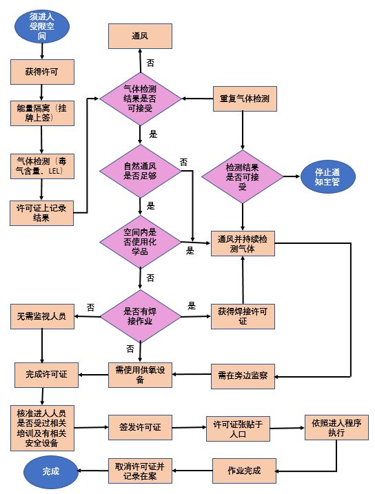 作業(yè)許可證 作業(yè)許可證是每次進入密閉空間前必須進行的程序,而該證只對一個密封 空間工作有效。任何進入密閉空間工作的作業(yè)人員必須向已獲授權(quán)簽發(fā)的負責人申請工作許可證。 許可證上必須列明準用及不準用的工具及施工規(guī)定。在簽發(fā)工作許可證前,負責人必須使工作地點的空氣達到安全程度,及在施工期間保持正常,并無危險;其他控制風險的措施也有效完成。 當?shù)竭_許可證所規(guī)定的完工時間,必須離開密閉空間,如須要延長時間工作,必須另行申請工作許可證。 工作許可證必須與風險評估報吿張貼在密閉空間附近顯眼處以便工作人員參閱。