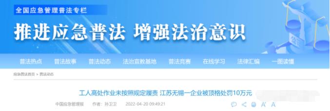 該公司在危險作業時,未按照規定履行職責,違反了《江蘇省安全生產條例》第二十四條第一款的規定,依據《江蘇省安全生產條例》第五十一條的規定,執法人員責令該公司限期改正,因該單位現場的安全監管人員及相關作業人員均未及時制止本次高處作業中存在的違章行為,對該公司處罰款10萬元的頂格處罰。