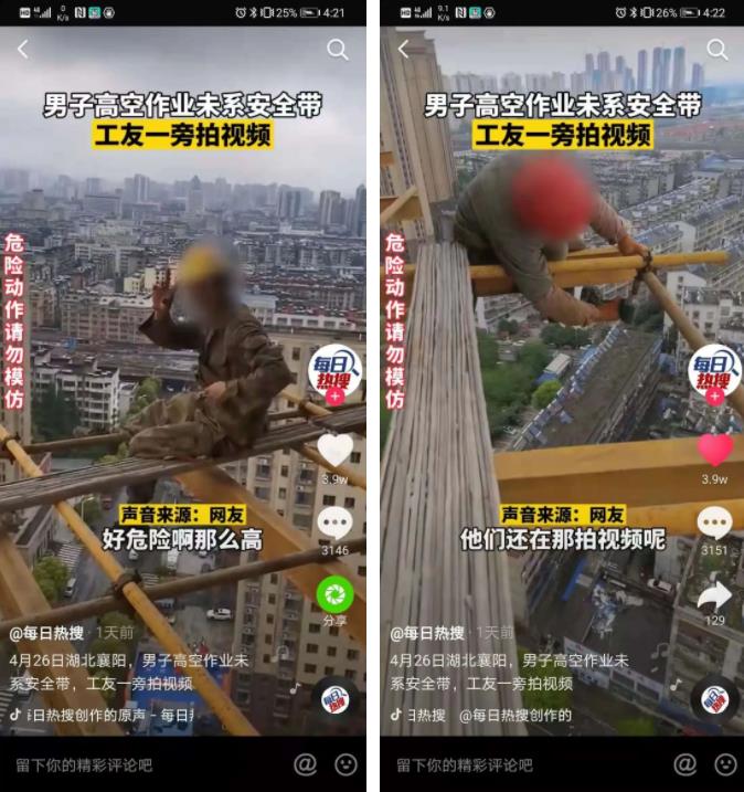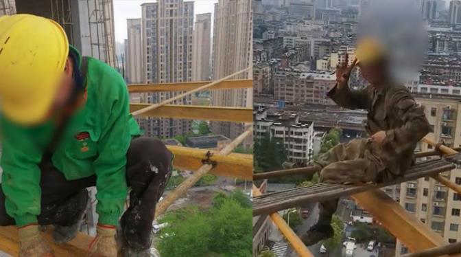 近日一則視頻引起熱議,多名工人高空作業不系安全帶,工友還拍視頻炫耀,令人揪心! 視頻中,一男子坐在腳手架上,雙腳懸空,對著鏡頭擺出“V”字手勢;另一名男子蹲在腳手架上,正在進行高空作業。鏡頭可見遠處可見大片高樓,二人身上均沒有系安全帶,令人不禁捏一把汗。